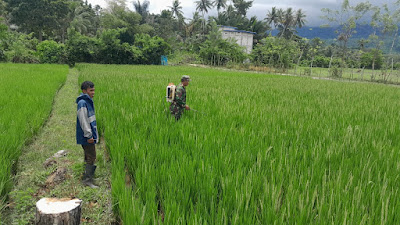 Buol - Anggota Babinsa Koramil 1305-07/Bunobogu Kopka Asrofil melaksanakan kegiatan pendampingan hanpangan membantu penyemprotan padi jenis Inpari di lahan seluas 0.05 Hk milik Bapak ismail, yang bertempat di Desa Pokobo, Kec. Bunobogu, Kab. Buol. Senin (28/4/25)